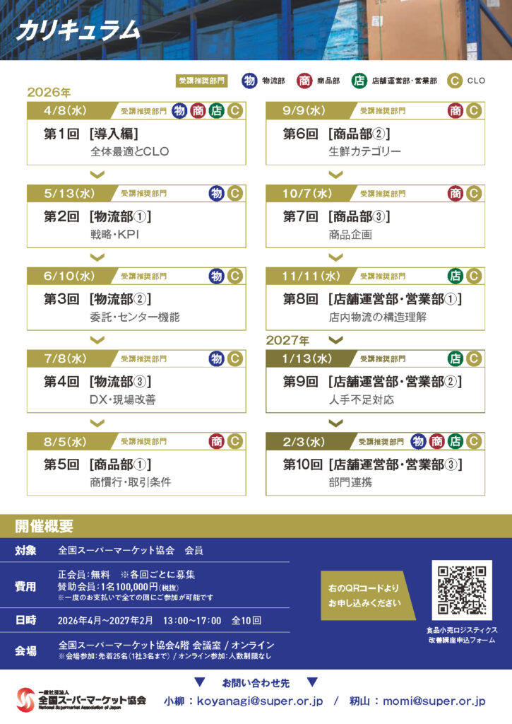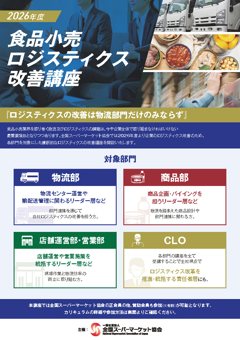 当協会では、昨今の食品小売企業における物流課題への意識を企業全体で向上いただくことを目的に「食品小売ロジスティクス改善講座」を4月より来年2月まで、全10回で開催いたします。